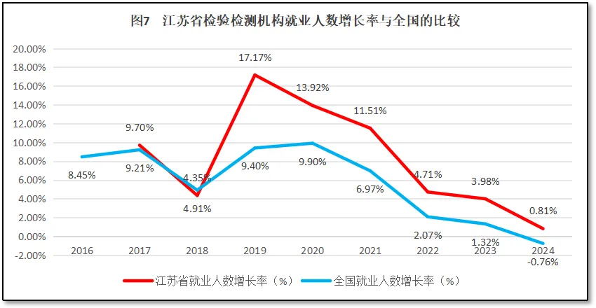由图7可见,2017-2018年,江苏省检验检测机构从业人数增长率与全国检验检测从业人数变化的曲线十分接近,在这之后江苏省检验检测机构就业人数出现一个较大的增长高峰,此后逐步下降,变化趋势与全国检验检测机构就业人数的变化趋势比较相似,只不过江苏省总体保持了相对高一些的增长率,到2024年度仍然还保持在正增长区间。